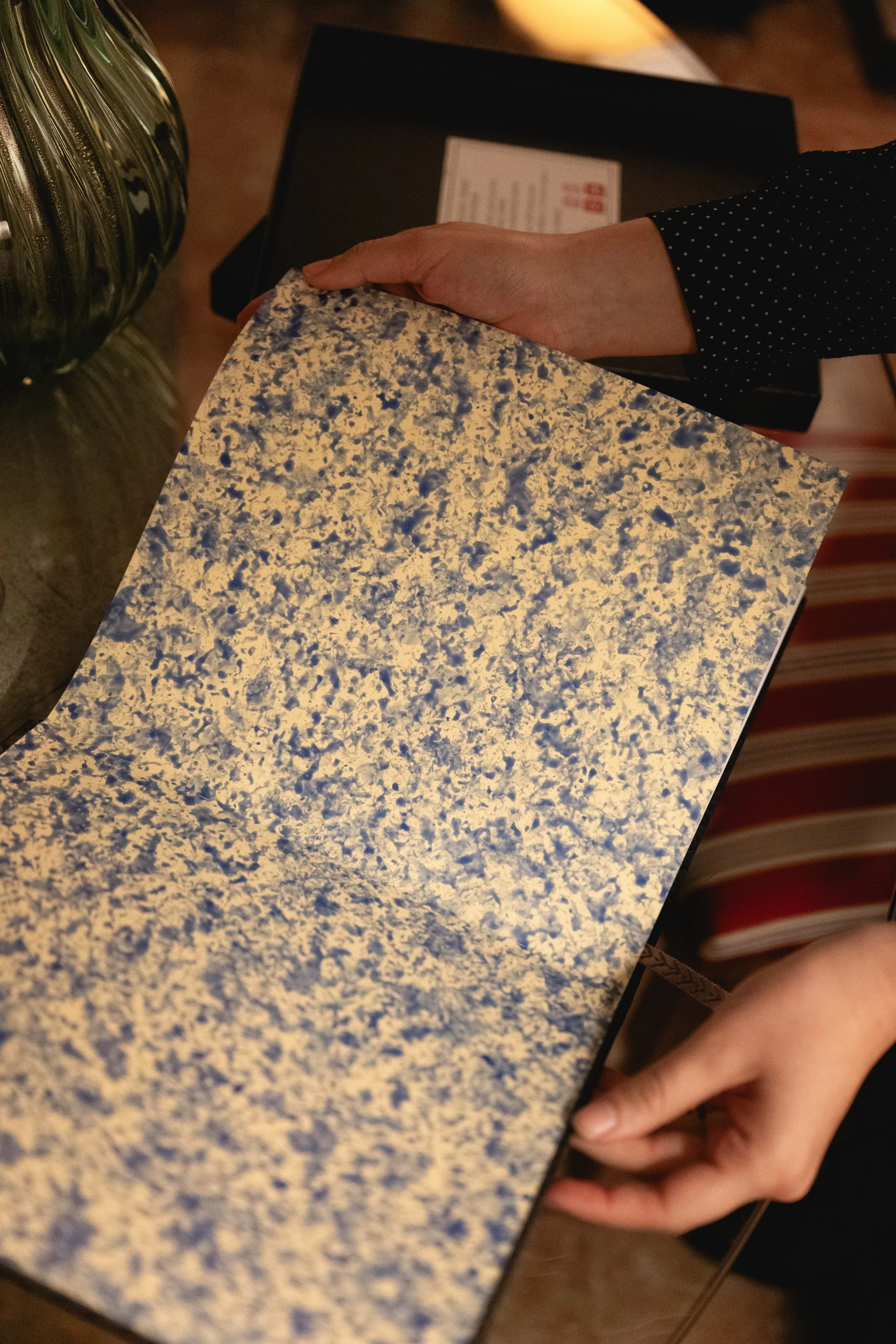 Atelier Gk is the only workshop in Florence to still produce handmade glue-sized paper, with colors customizable to order. The endpapers are crafted from hand-marbled paper, and the entire volume is bound by hand using the most traditional techniques, preserved and safeguarded by the atelier.