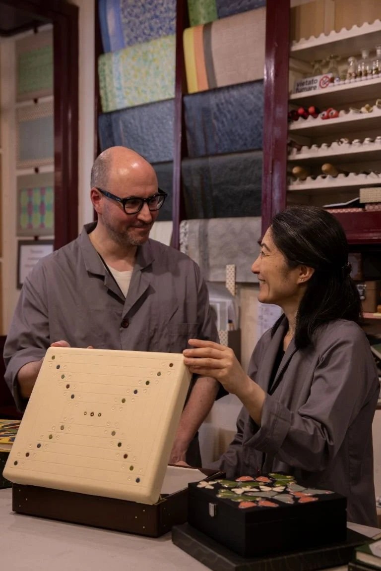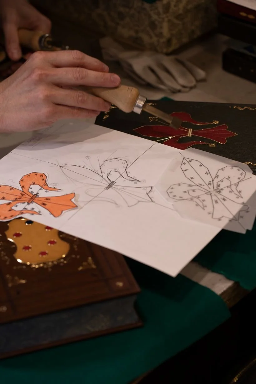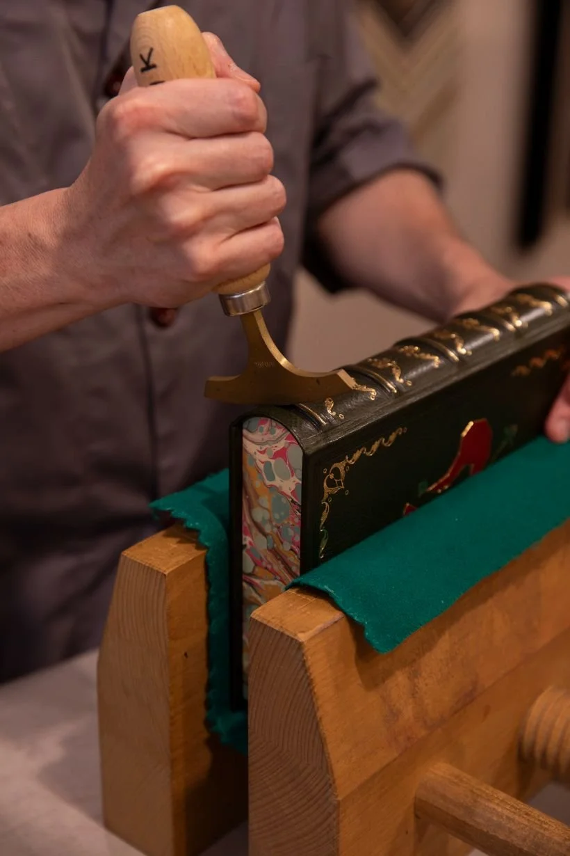 Rare are the skills of this unique craft, mastered by Lapo, the last of six generations of Florentine master bookbinders. Rare are the materials at their finest: Tuscan leather, handmade glue & marble paper, gold and silver leaf, and original silk kimonos from Michiko’s private collection. Rare are the tools of the trade, some specially made, others faithful companions of generational work.