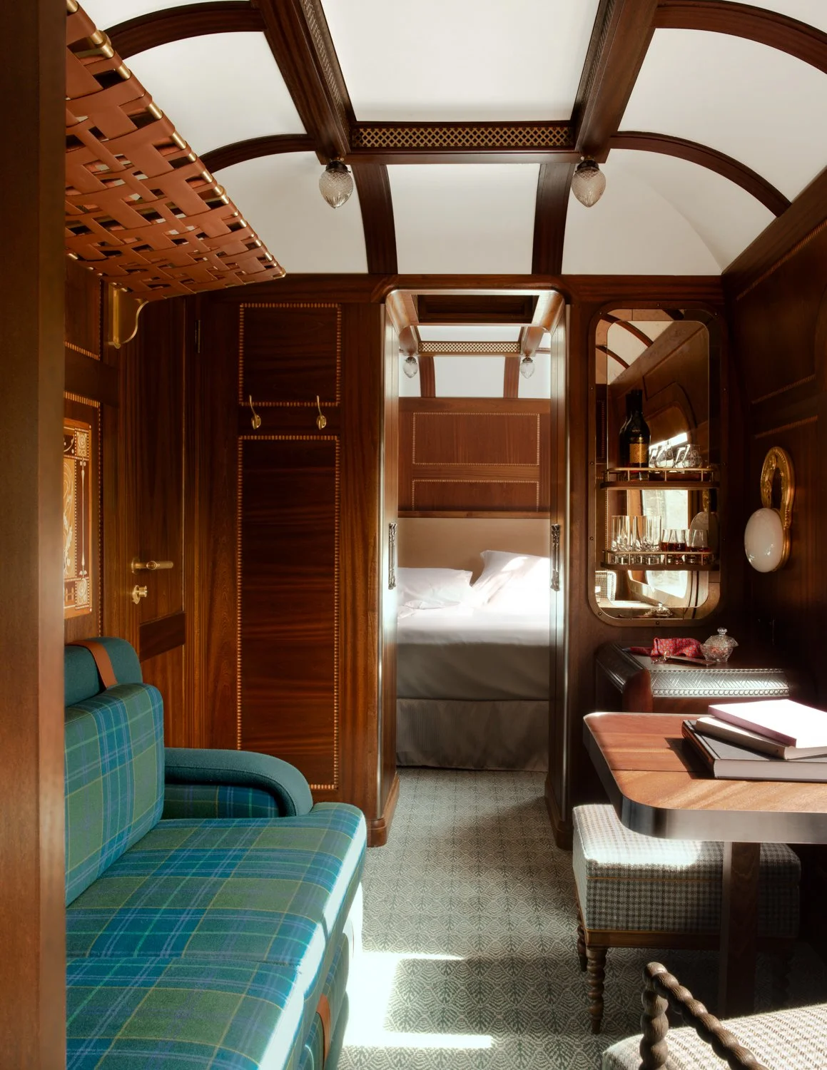 After a few moments indulging in the entrance lounge, where perfect strangers become friends over the finest spirits, we moved along wood-panelled corridors, casting quick but aware glances into the opulent cabins, as to absorb as much of that splendour as possible: a grandeur of yesteryear that finds its place into the world of contemporary luxury, exquisitely adorned with custom-designed tartans and tweeds combined with the finest wood marquetry and precious amenities.