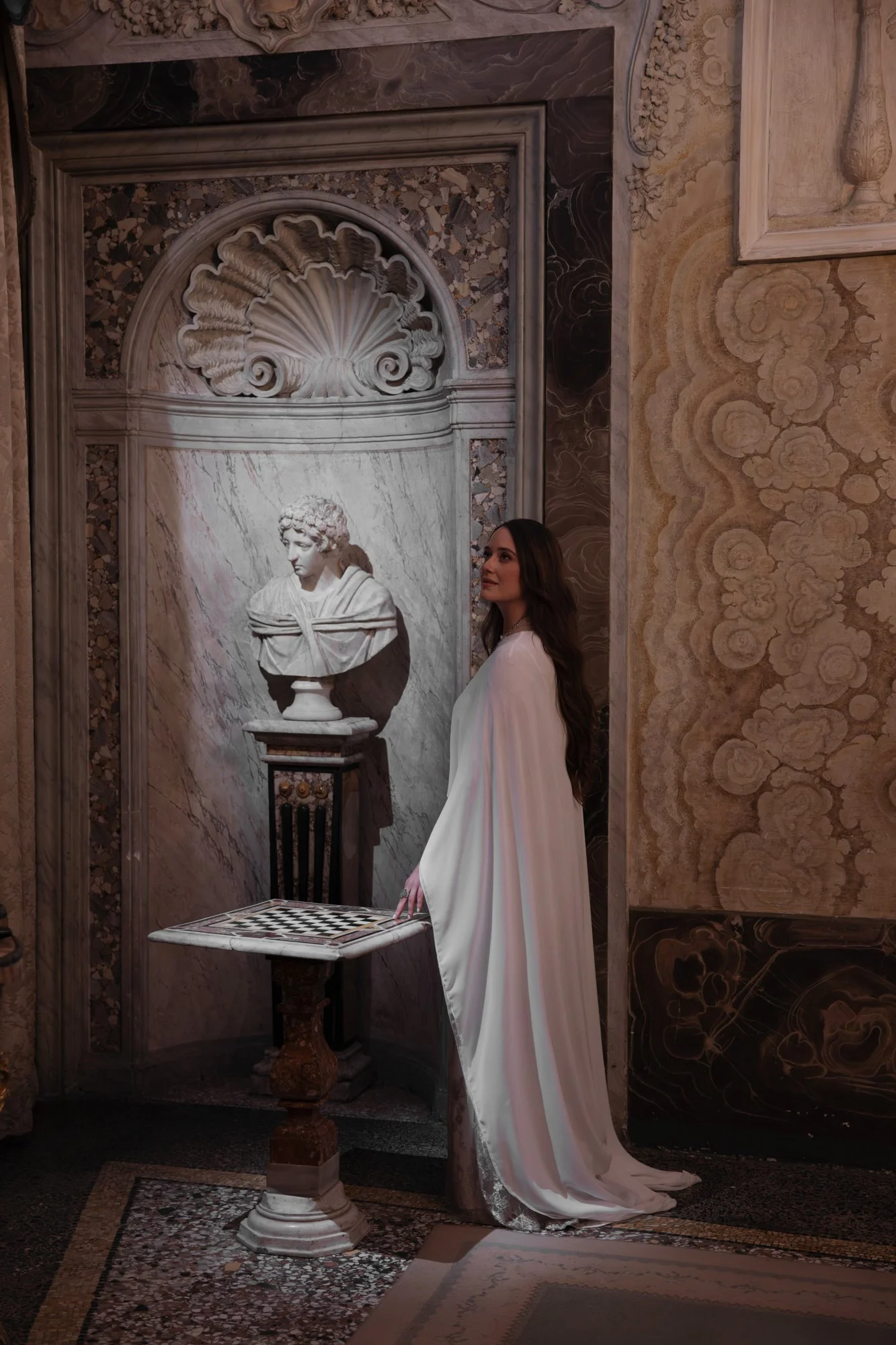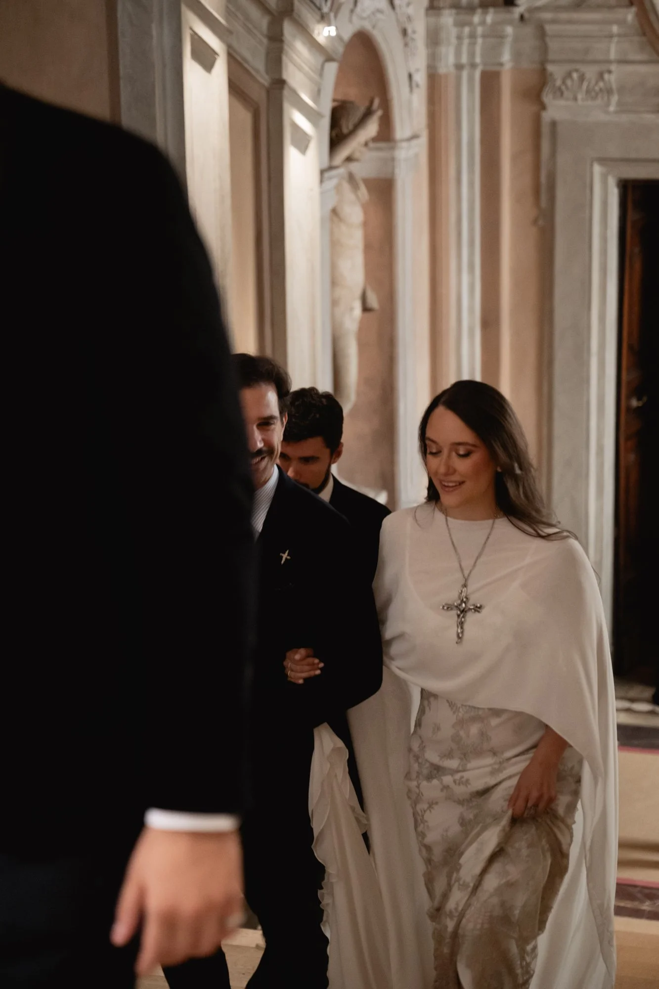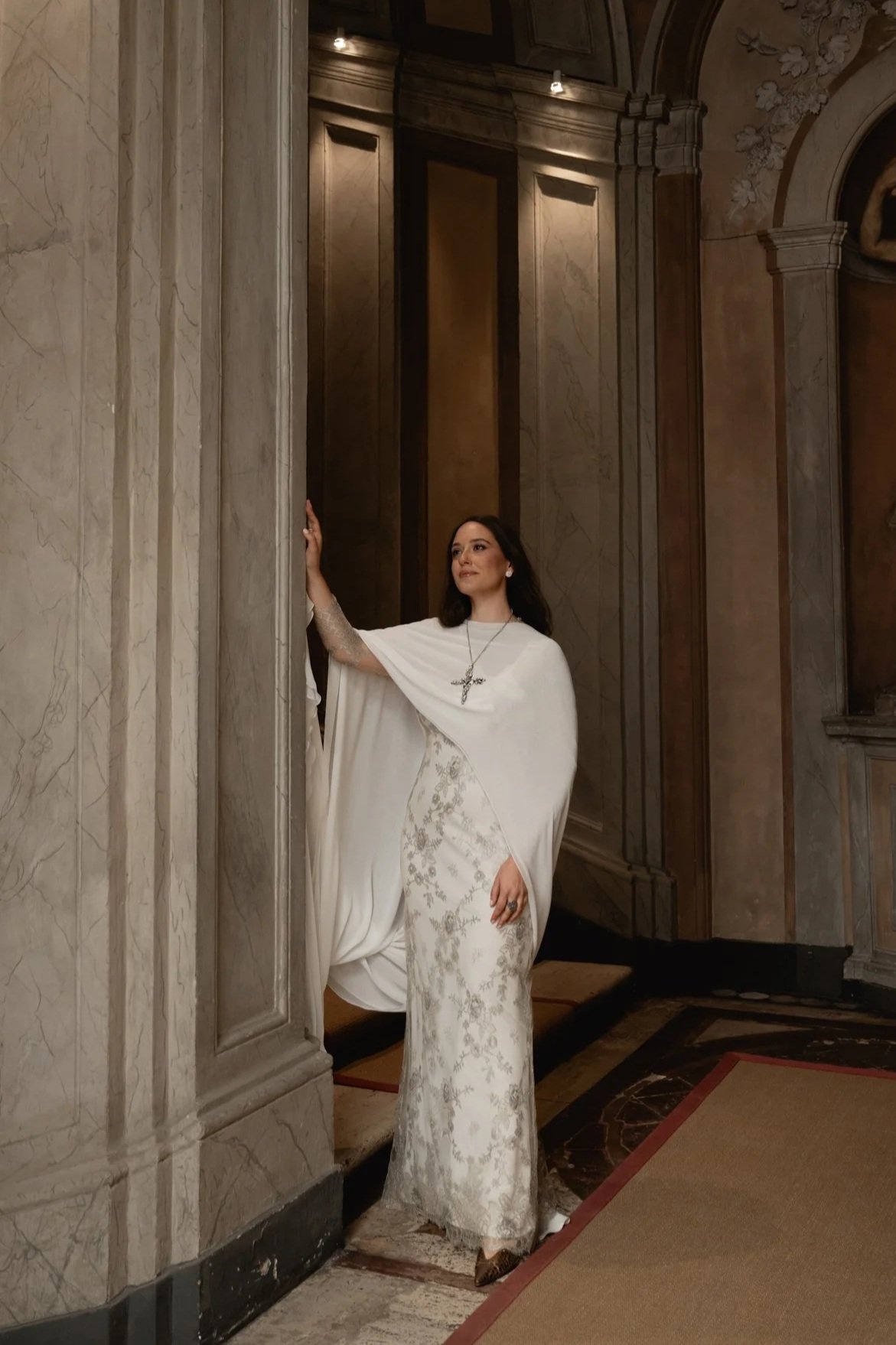 For this year’s edition, Sacrum et Lumen, I wore a cloud of pure white silk by the roman atelier Antonella Rossi, draped over a whisper of pearl-grey French Chantilly lamier lace sewn by Annagiulia Firenze. The immaculate white cape beautifully enhanced the precious "Pax Tibi" Cardinal cross, a unique jewel crafted by Paolo Penko and the emblem of #Symposium2025.