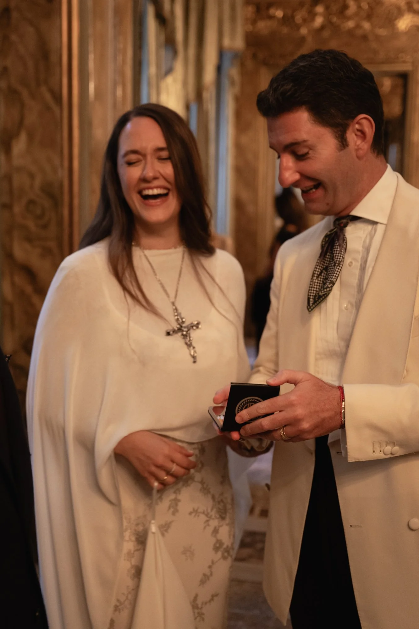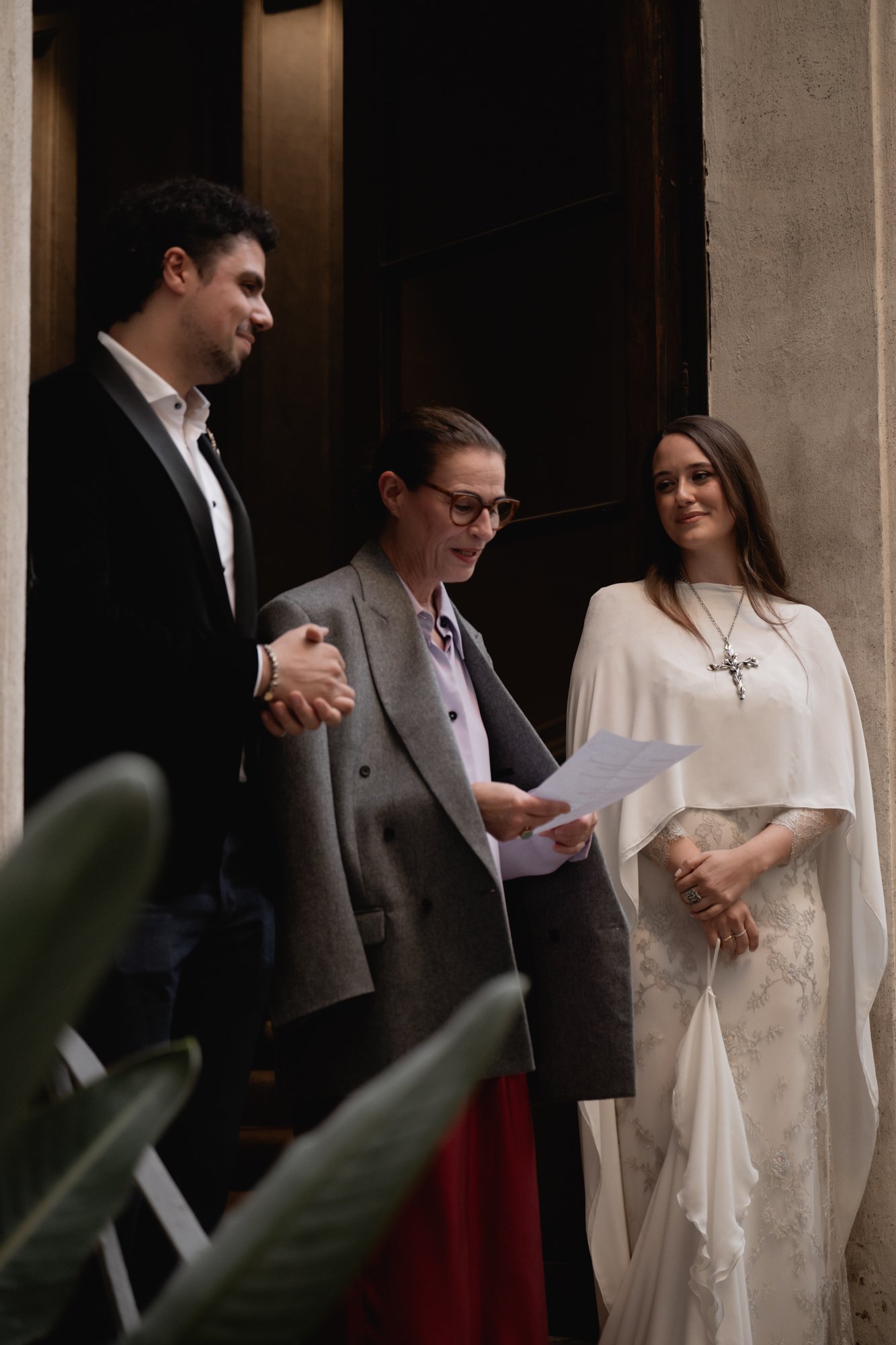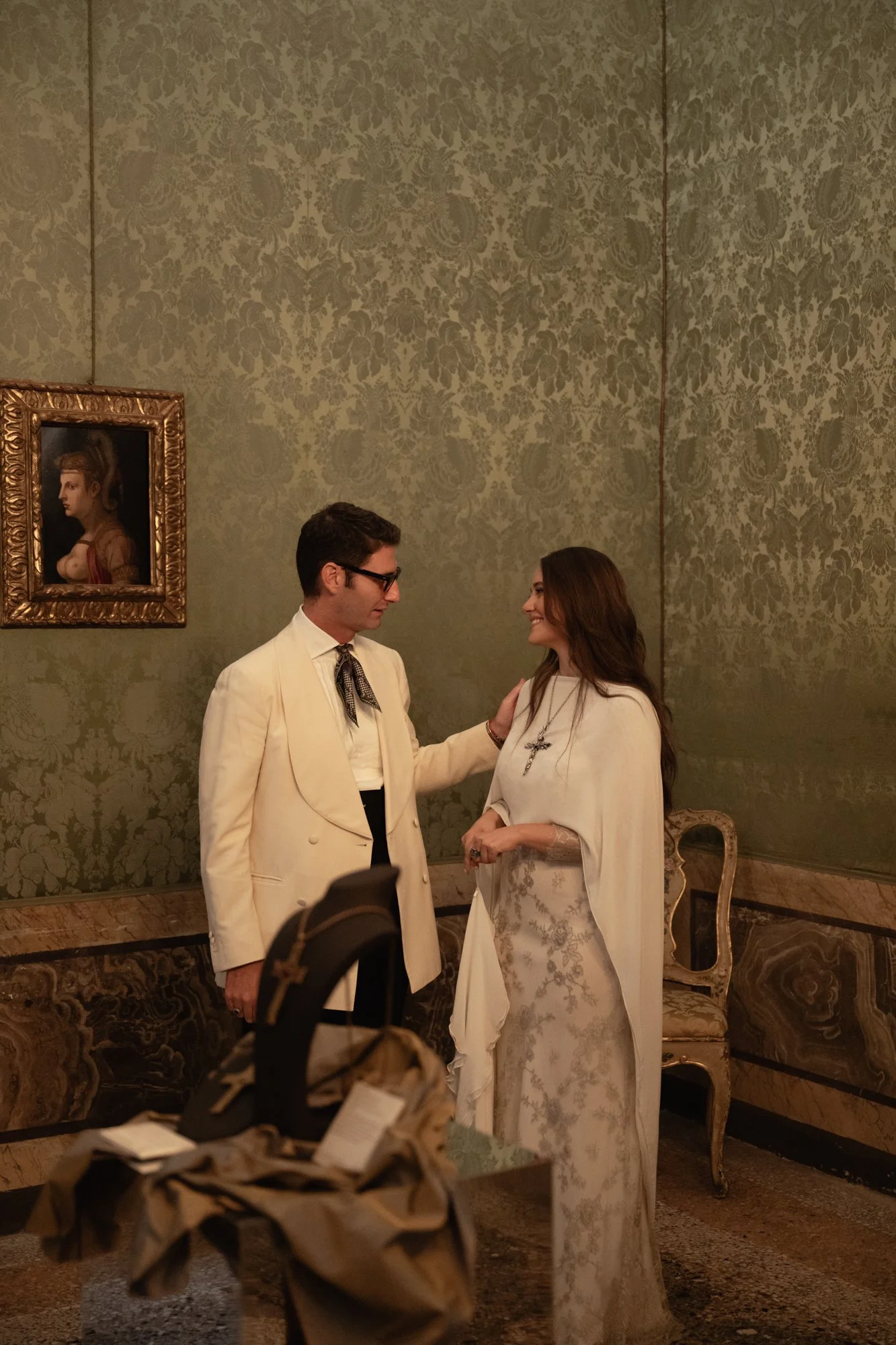 For this year’s edition, Sacrum et Lumen, I wore a cloud of pure white silk by the roman atelier Antonella Rossi, draped over a whisper of pearl-grey French Chantilly lamier lace sewn by Annagiulia Firenze. The immaculate white cape beautifully enhanced the precious "Pax Tibi" Cardinal cross, a unique jewel crafted by Paolo Penko and the emblem of #Symposium2025.