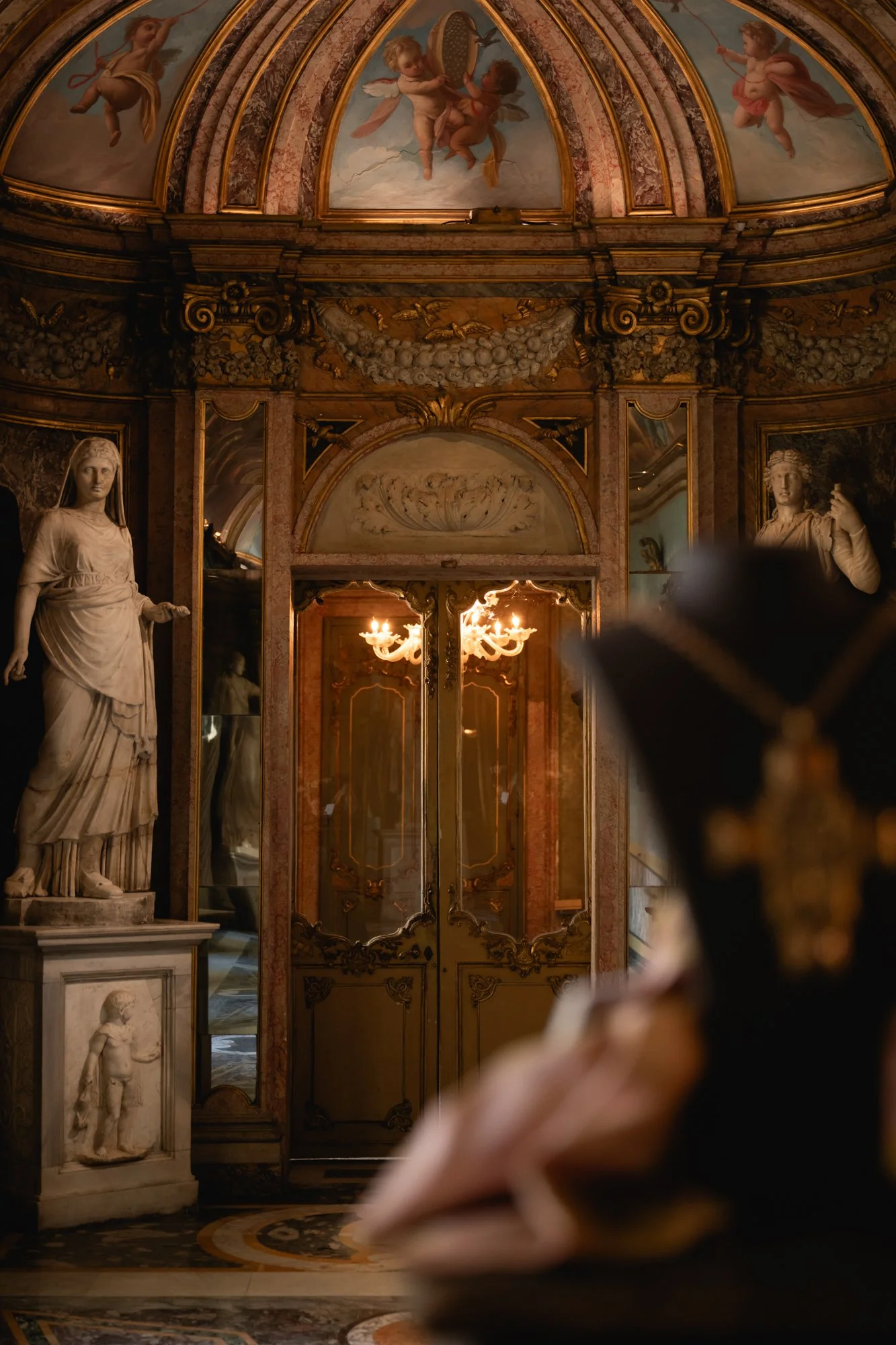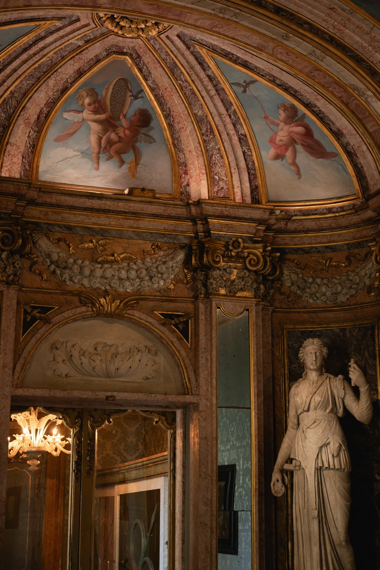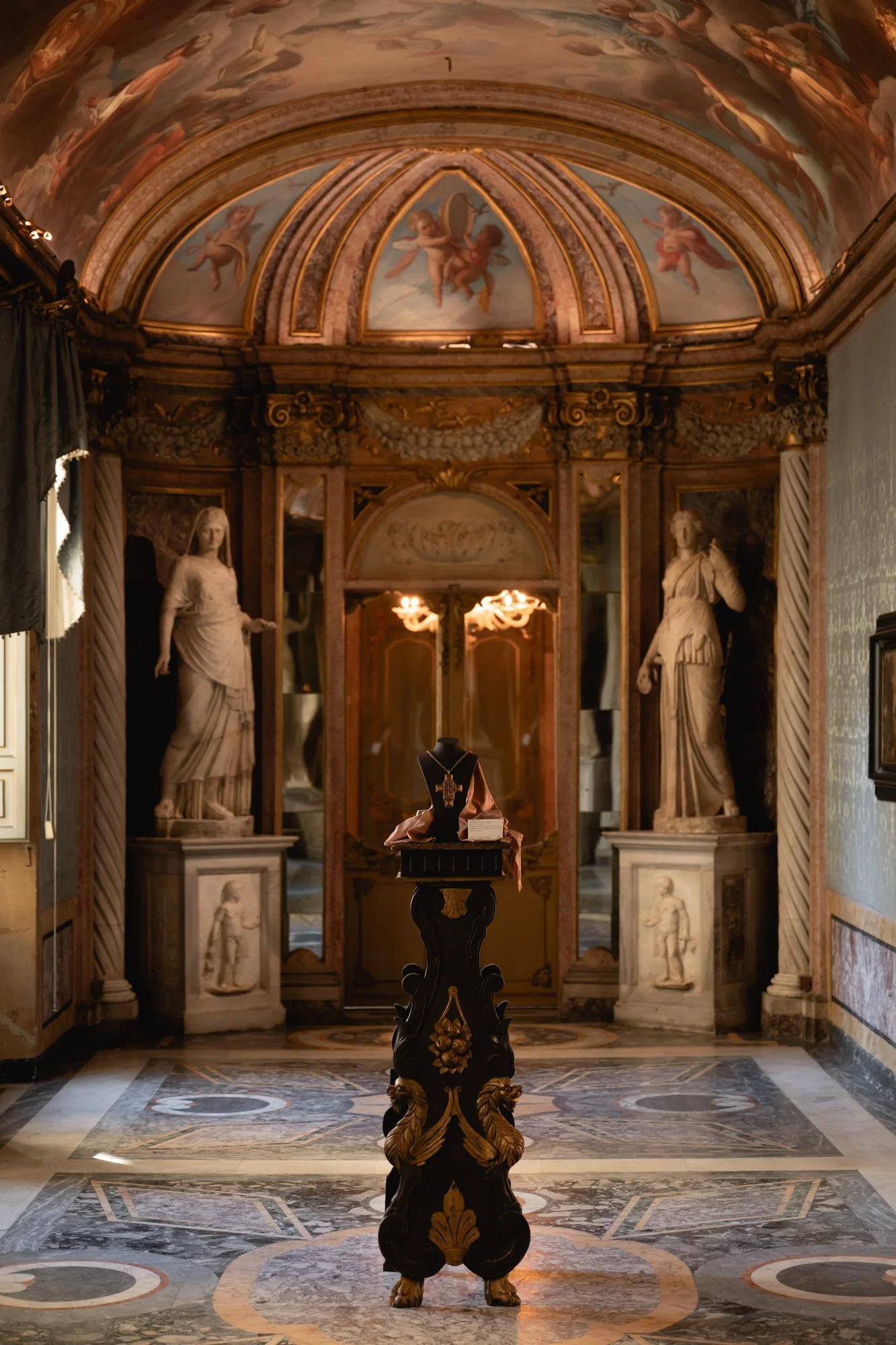 Every surface speaks his vision: the floors inlaid with rare marbles, the frescoed vaults rich with family symbols and iconography, the micro-mosaics of impossible delicacy, the collection of Roman statues standing sentinel in quiet grace...