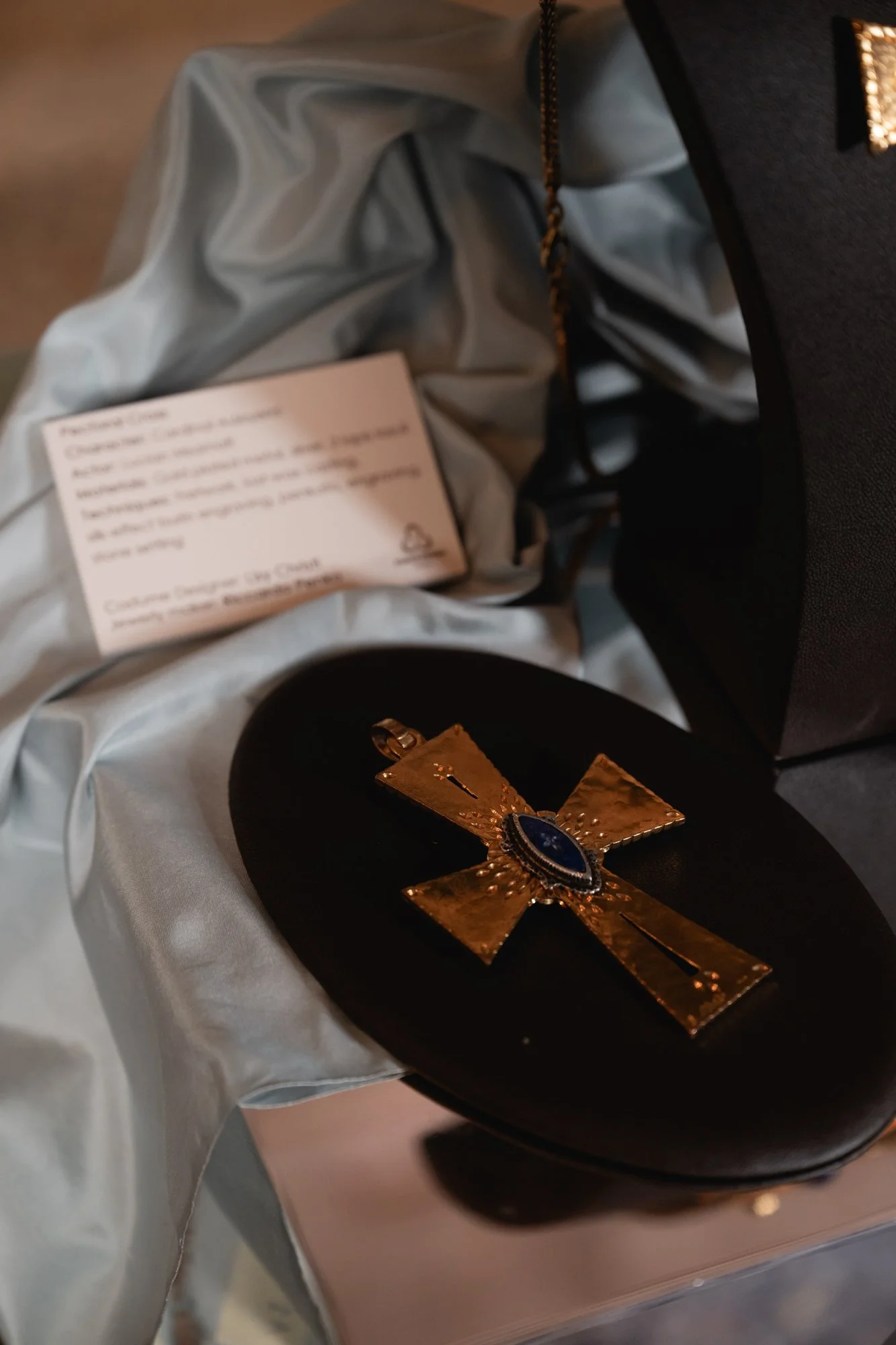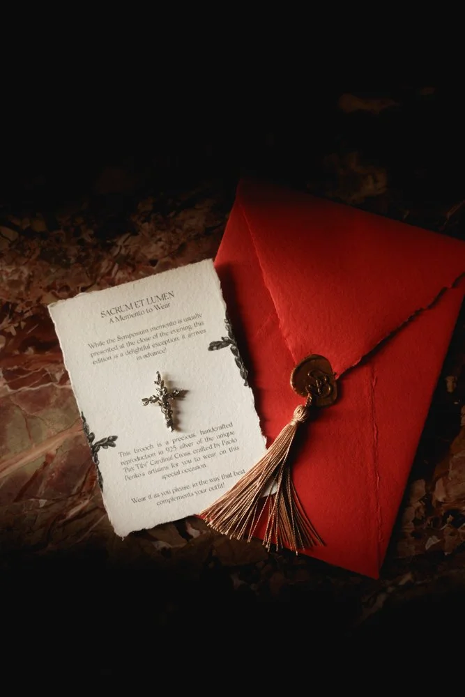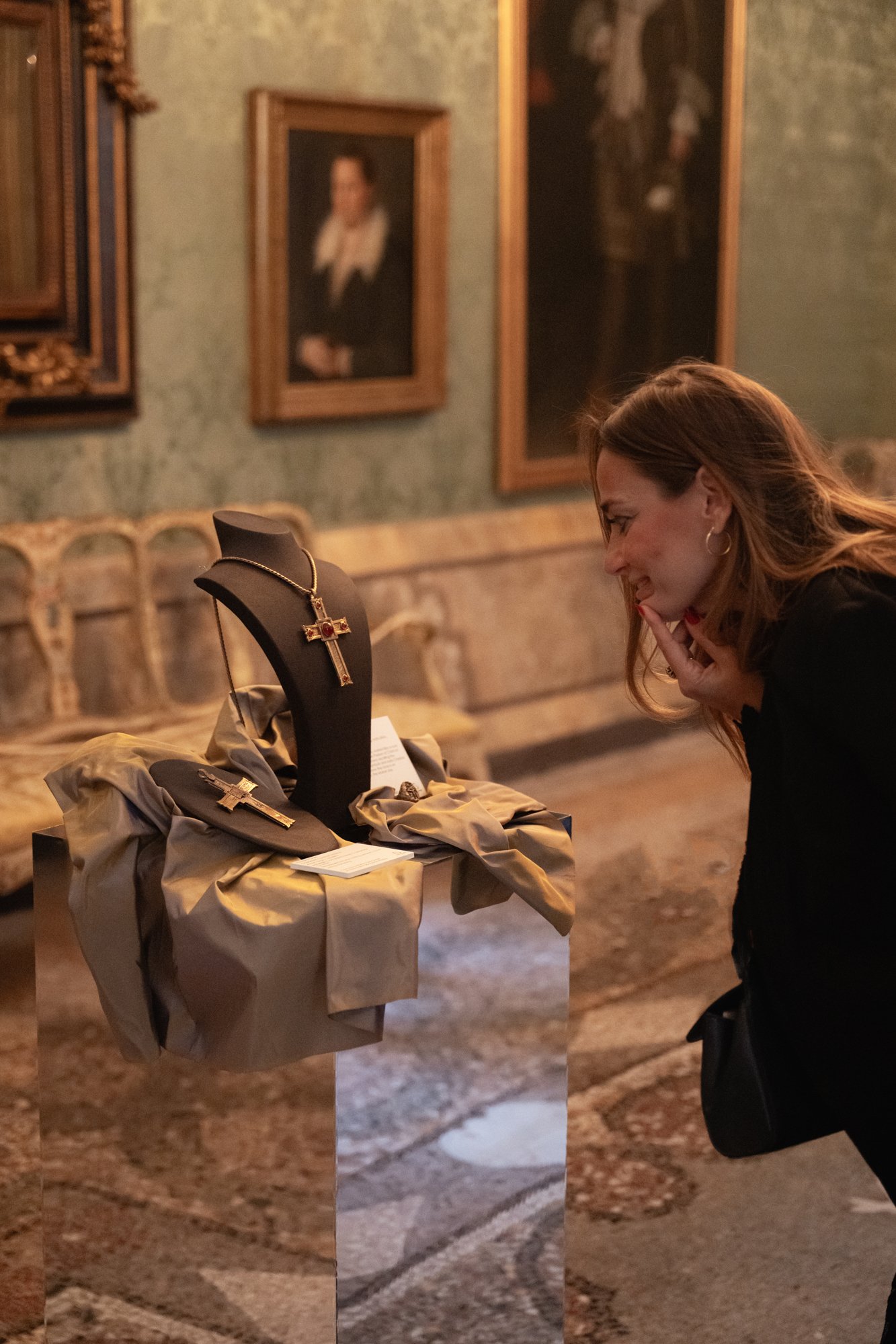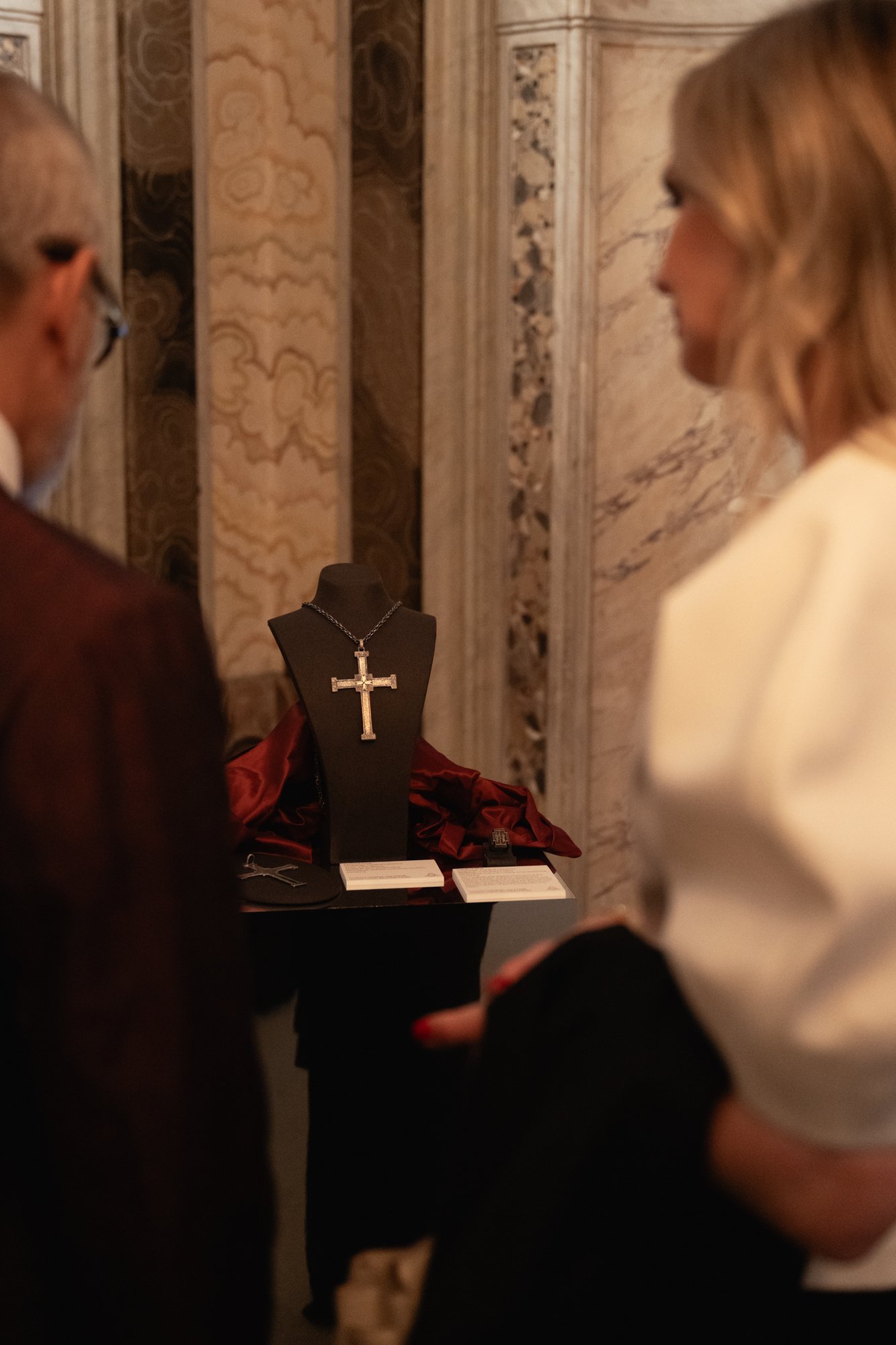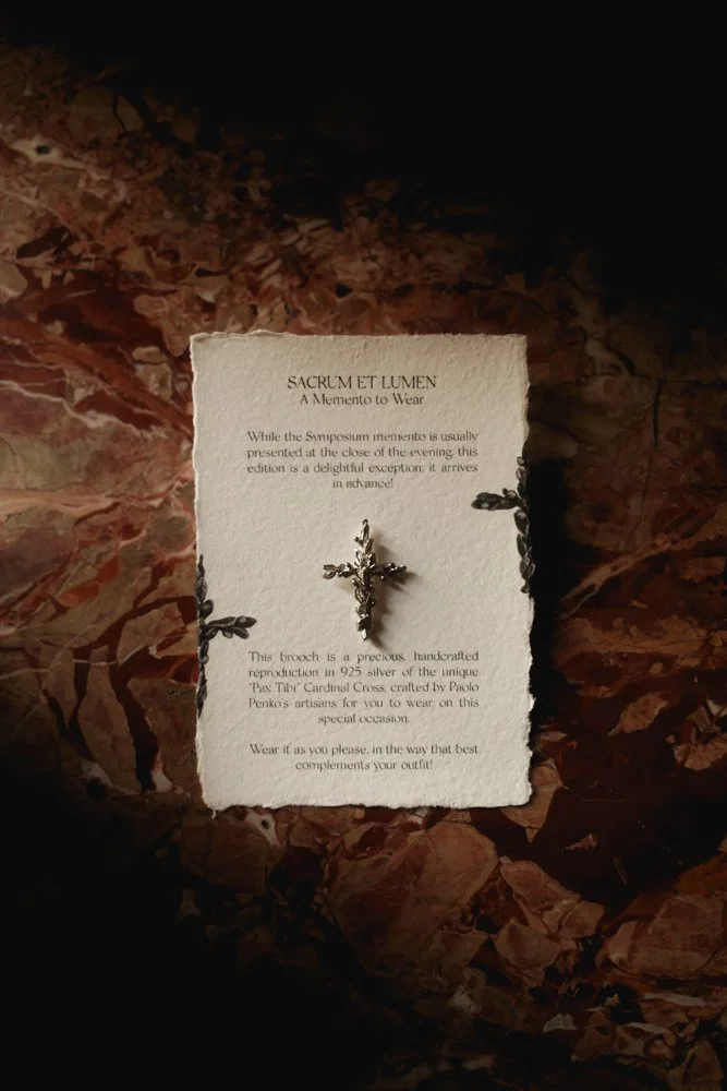 We chose it as the centrepiece of the exhibition and the unifying symbol of #Symposium2025. Displayed in a place of honour, it became a quiet yet powerful emblem of the event’s spirit. I wore one of the two copies created for Conclave with pride and honour; and so, in a way, did all our guests, each of whom received a small, precious replica in 925 silver, handcrafted by Paolo Penko and nestled within their paper invitation. These delicate crosses, worn as part of each ensemble, became both precious adornment and shared memento of the event.