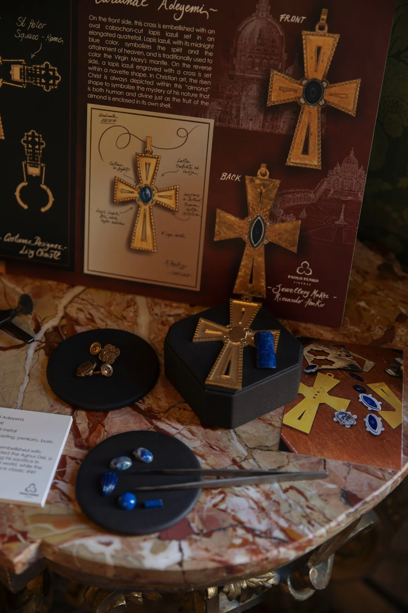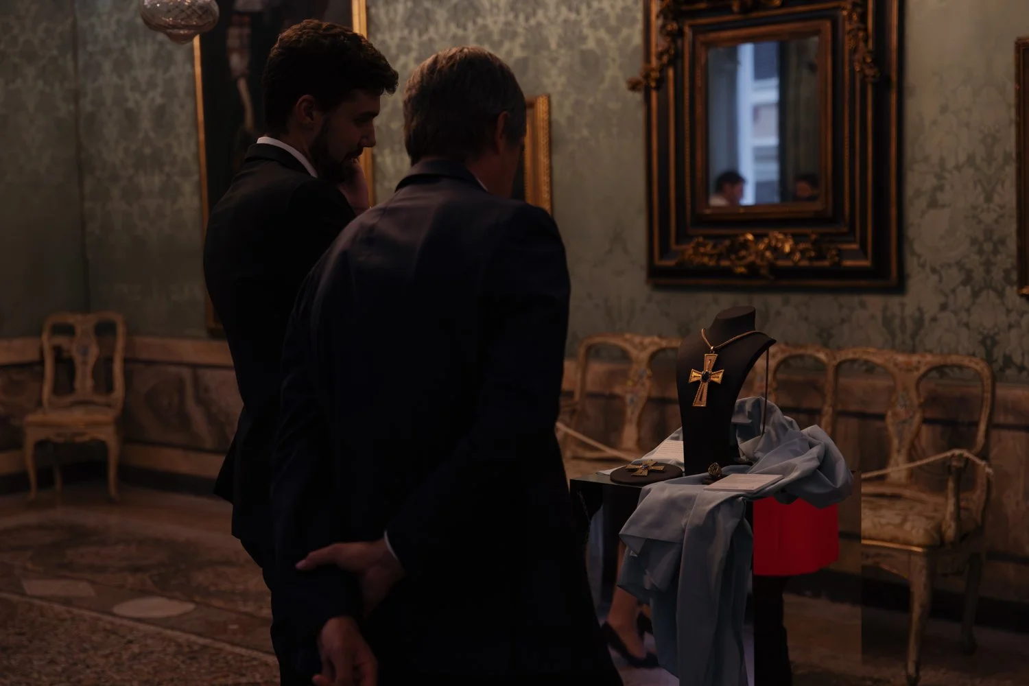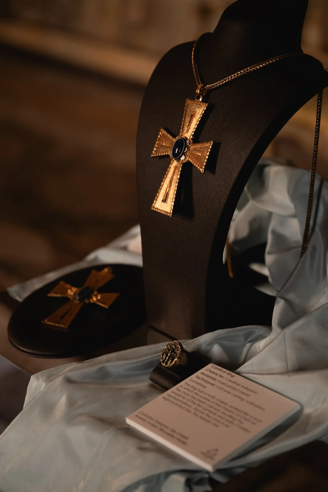 We chose it as the centrepiece of the exhibition and the unifying symbol of #Symposium2025. Displayed in a place of honour, it became a quiet yet powerful emblem of the event’s spirit. I wore one of the two copies created for Conclave with pride and honour; and so, in a way, did all our guests, each of whom received a small, precious replica in 925 silver, handcrafted by Paolo Penko and nestled within their paper invitation. These delicate crosses, worn as part of each ensemble, became both precious adornment and shared memento of the event.