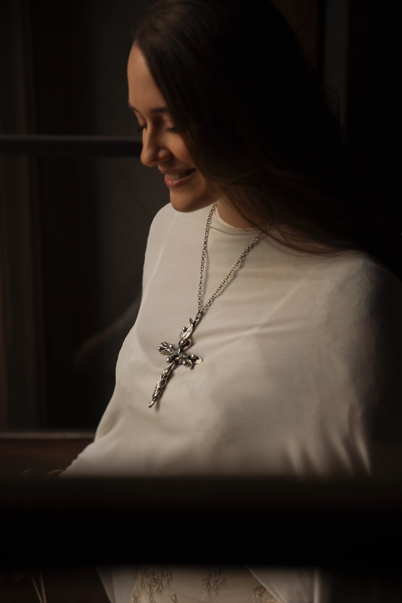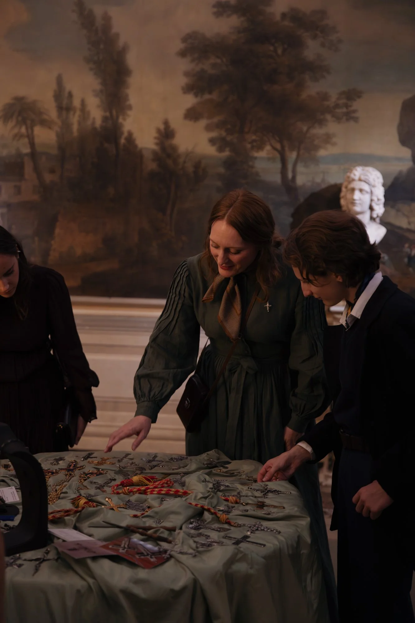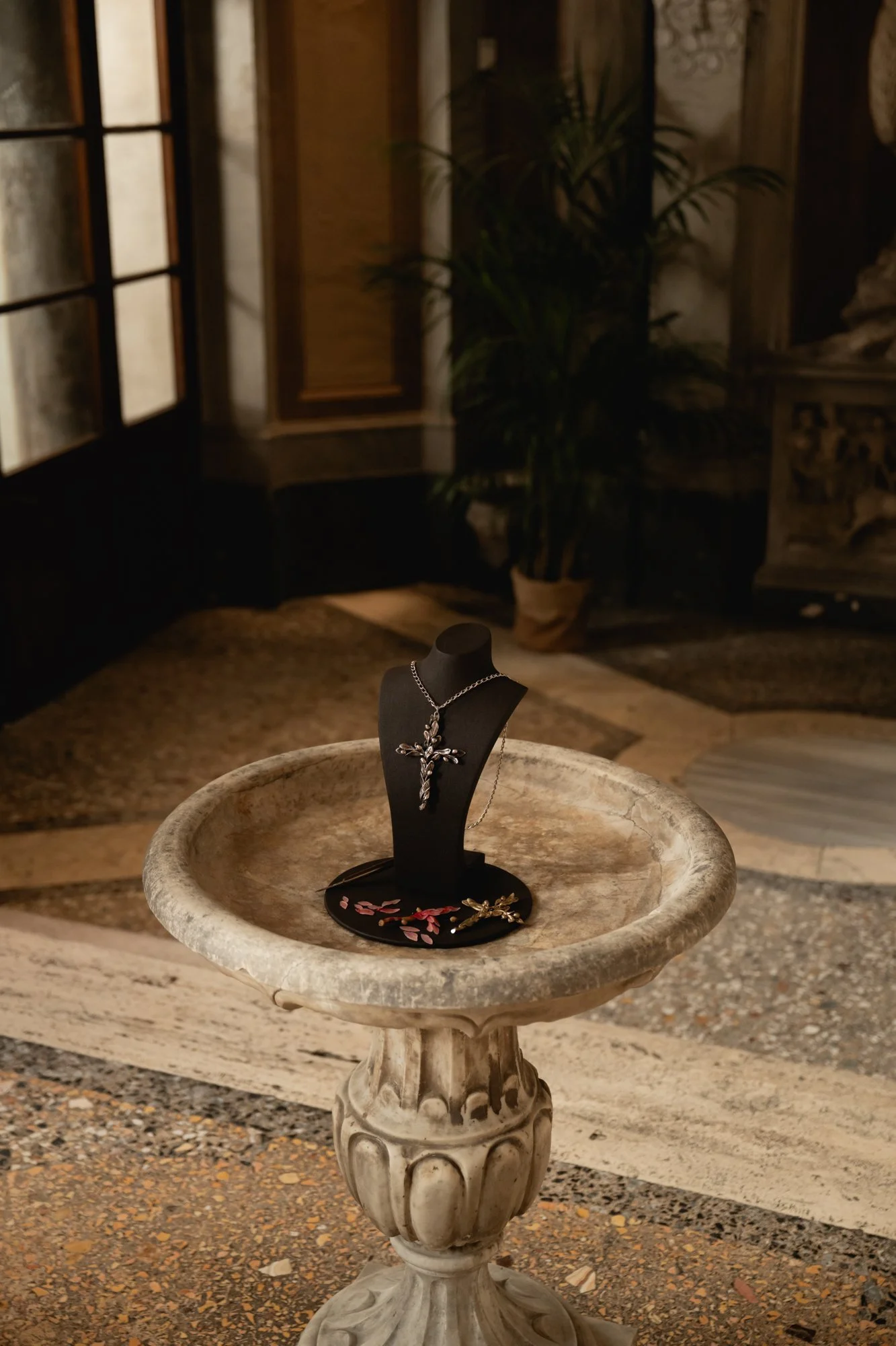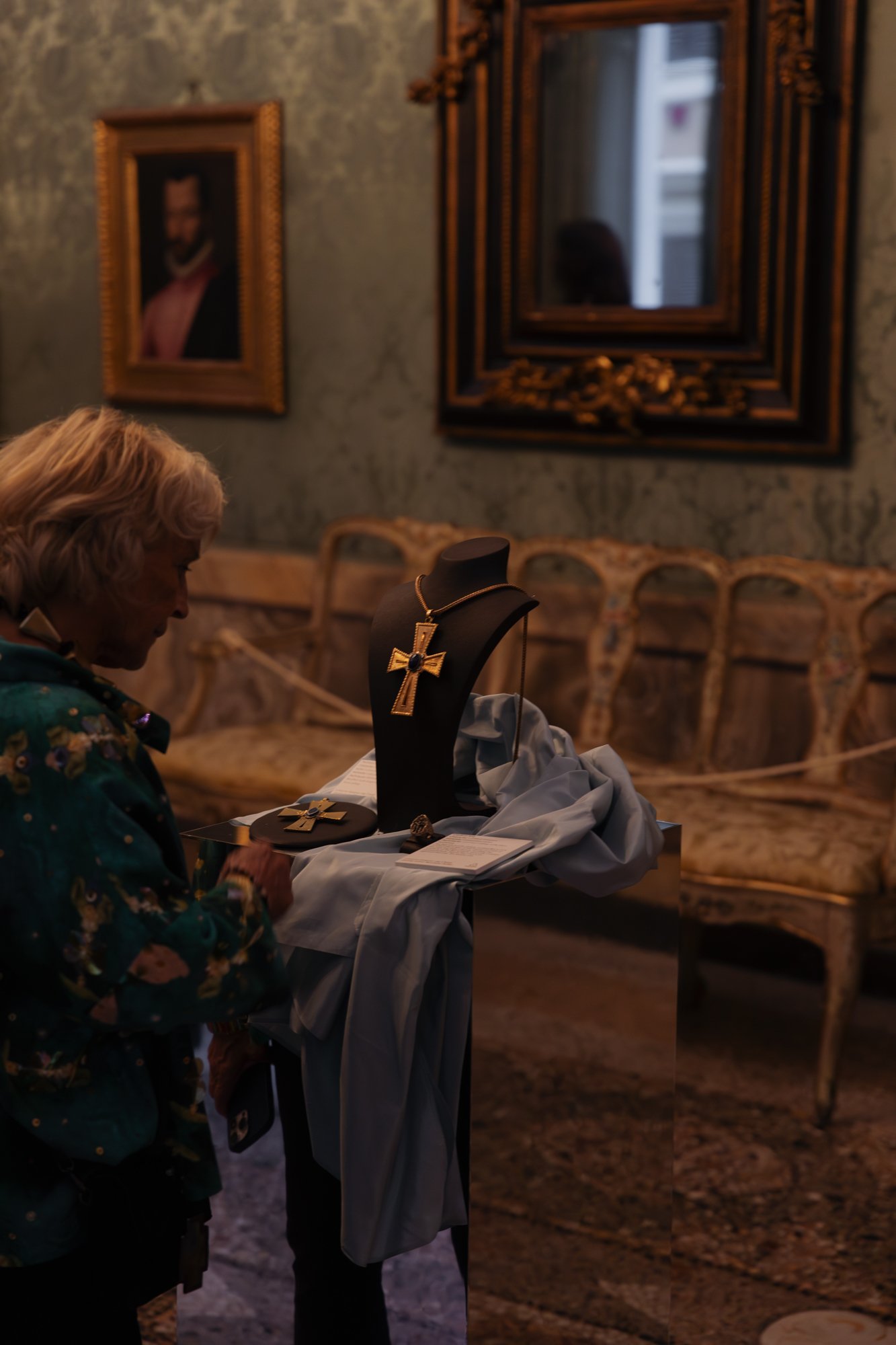 We chose it as the centrepiece of the exhibition and the unifying symbol of #Symposium2025. Displayed in a place of honour, it became a quiet yet powerful emblem of the event’s spirit. I wore one of the two copies created for Conclave with pride and honour; and so, in a way, did all our guests, each of whom received a small, precious replica in 925 silver, handcrafted by Paolo Penko and nestled within their paper invitation. These delicate crosses, worn as part of each ensemble, became both precious adornment and shared memento of the event.