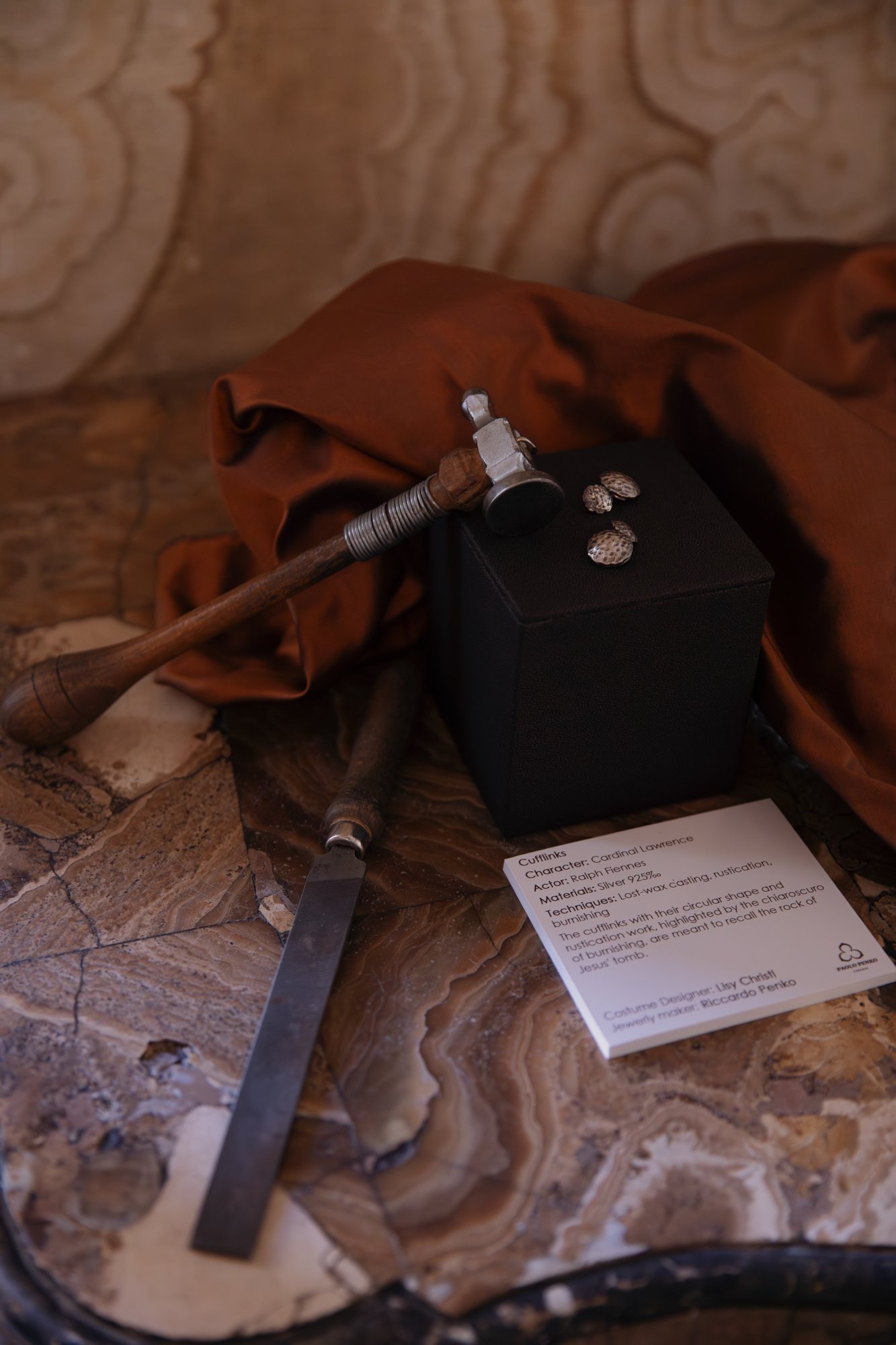 Originally conceived for Cardinal Lawrence (masterfully portrayed by Ralph Fiennes), the 'Pax Tibi' cross was later replaced by a piece more aligned with the character’s evolution and inner journey, this makes it an unseen and unedited piece! Its design interlaces three olive branches, a plant steeped in spiritual resonance within the Christian faith: in the Old Testament, a dove carrying an olive branch announced to Noah that life had returned to the earth. In the New Testament, the olive tree evokes the Passion of Christ, recalling the Garden of Olives where He prayed before His arrest.